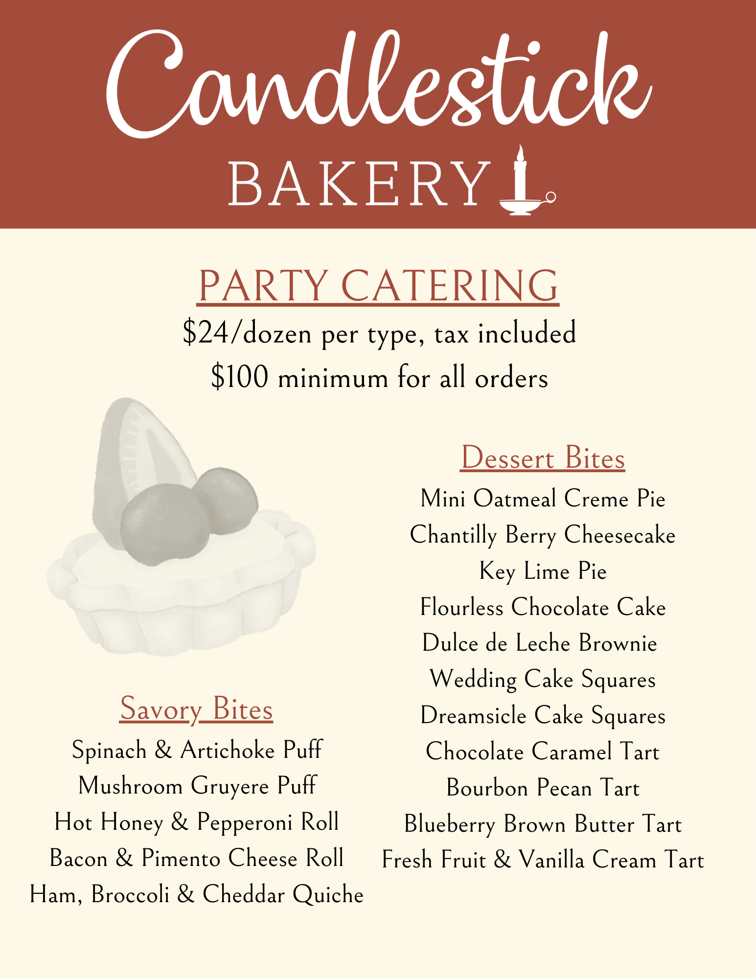 We would love to cater your party, meeting, or gathering. Browse our menus to see our offerings, and fill out our contact form at the bottom of this page to start an inquiry! Please note, we have a $100 minimum for all catering orders.